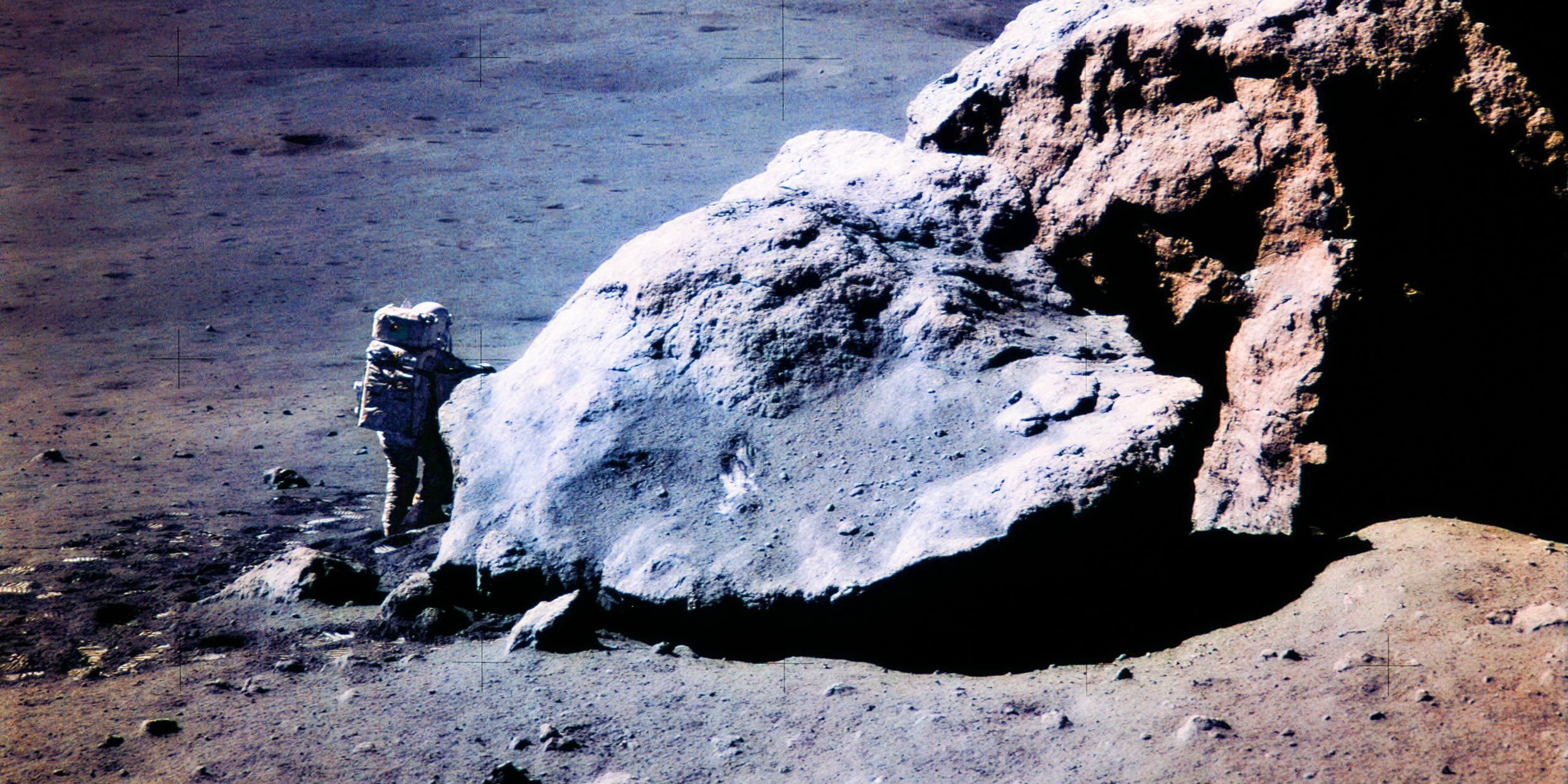 Another few billion years passed — until, in 1969, spacefaring explorers paid their first visit to the silvery kingdom. More came, jumping about, driving around, posing for photographs and hammering mechanical marvels into the soil. And just before Christmas in 1972, Eugene Cernan and Harrison Schmitt, the latter of which remains the sole geologist sent to the Moon, saw a curious-looking boulder standing alone near the south-eastern edge of the Sea of Serenity.