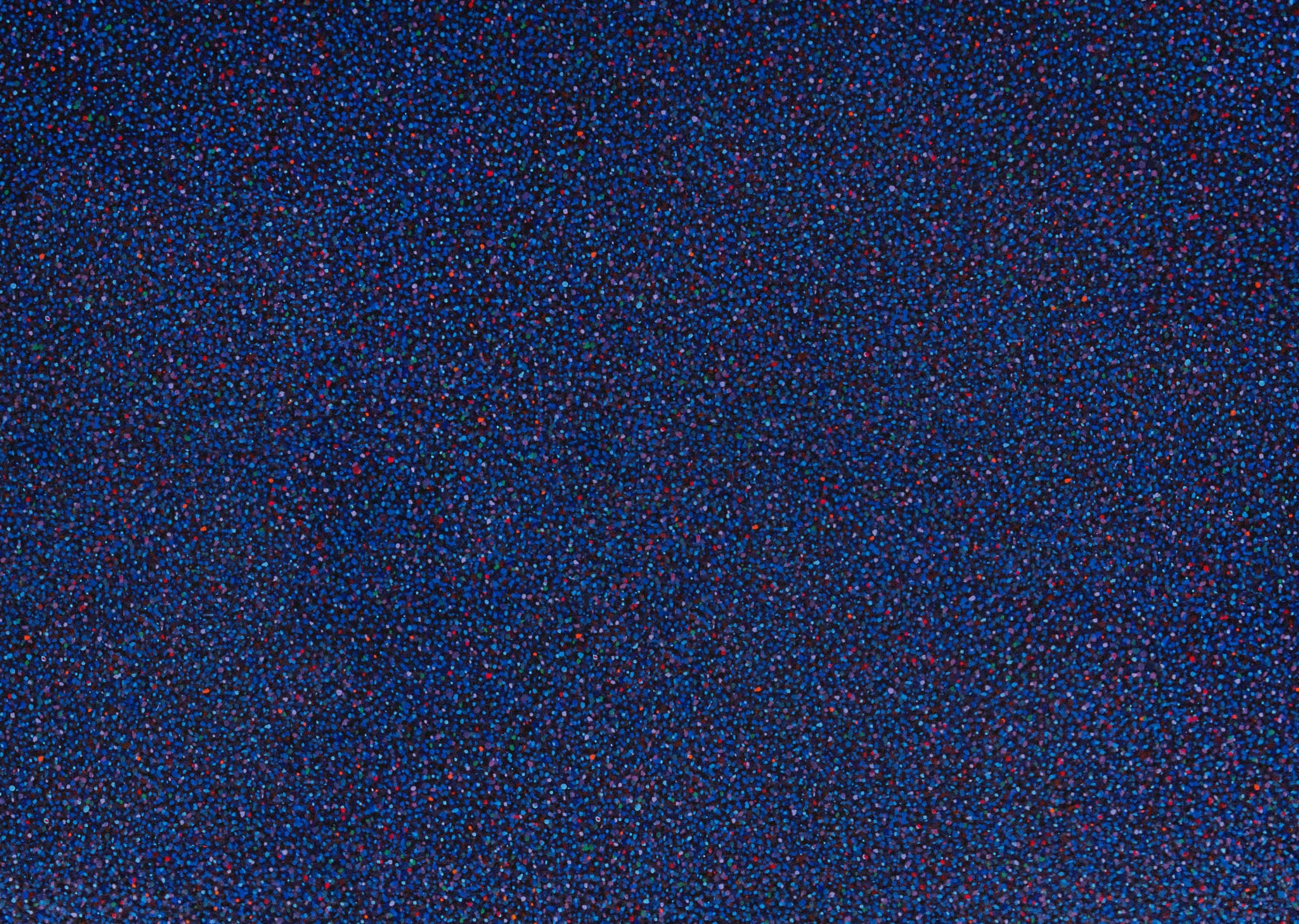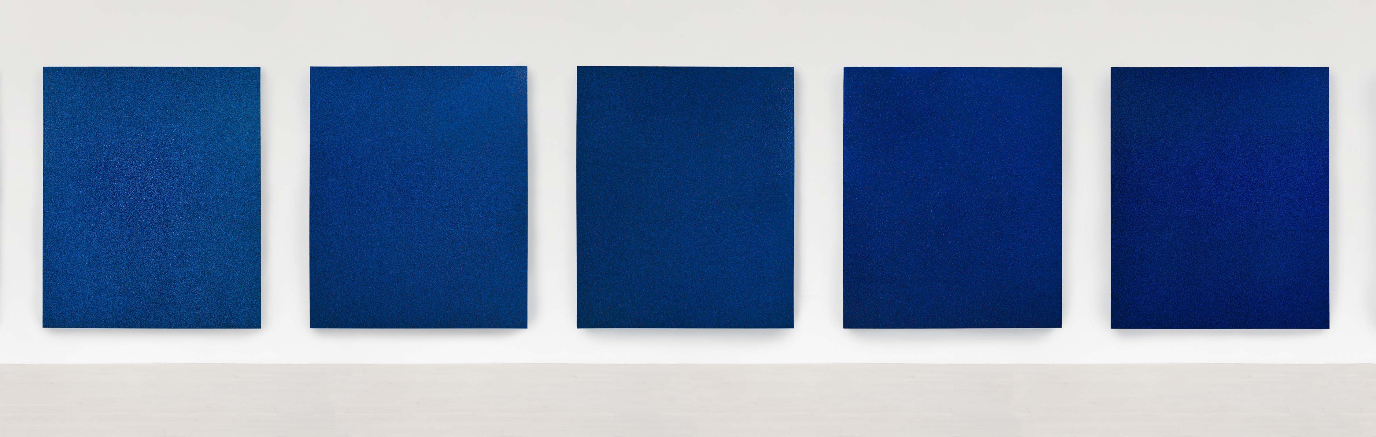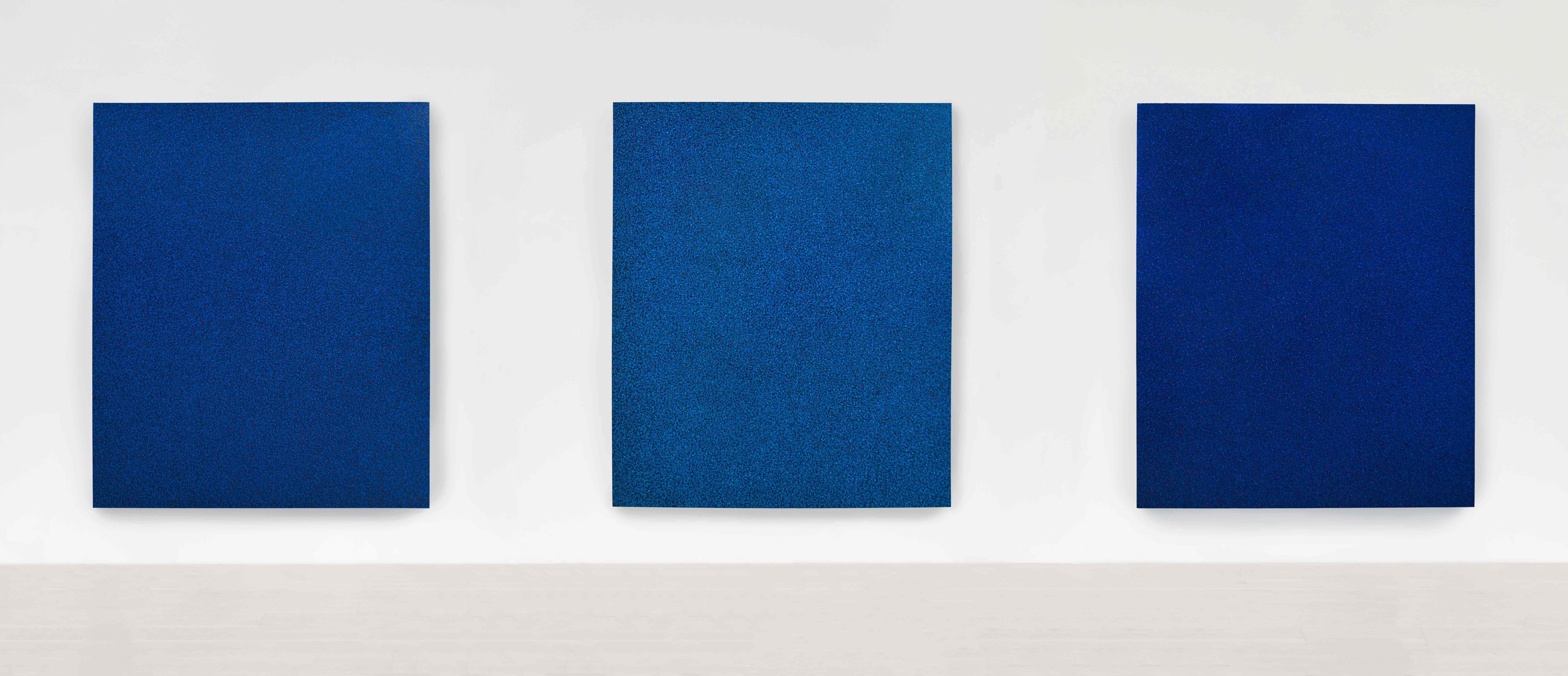A Moving Frequency comprises of eight, identically-sized, 70 7/8 X 59 1/16 in. (180x150 cm) paintings, each giving a shade of a deep, ethereal, iridescent blue. "Approximated and rendered physically in acrylic paint, these vibrant dots together form a highly material pictorial surface of variegated color, depth, and texture that, when seen from close to, appears to suggest an infinite and energized field of collectively pulsating particles," explained the Mignoni in a press release for the opening. "Seen from further away, however, this pointillistic cosmic soup fuses in the eye of the viewer into a single, shimmering, near-monochromatic field of color that radiates on a single, penetrative blue wavelength."