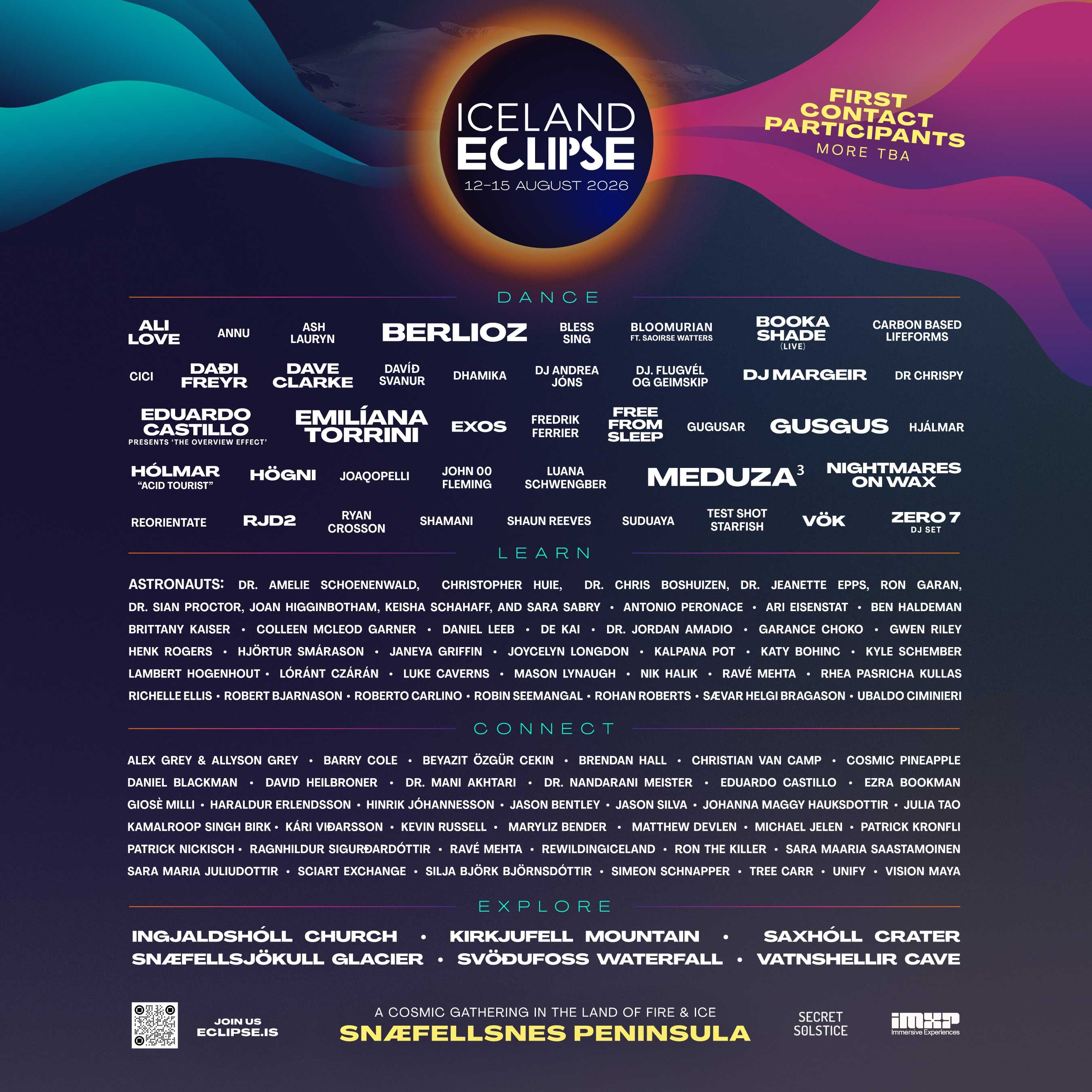 Can a music festival be a cosmic gathering? The 2026 eclipse is the headliner, music is its afterglow. Live sets from local legends will reflect the ethereal nature of Iceland itself with performances from electronic luminaries GusGus, Dream Pop trio Vök, anthemic pop act Daði Freyr, and singer-songwriter Ásgeir.
