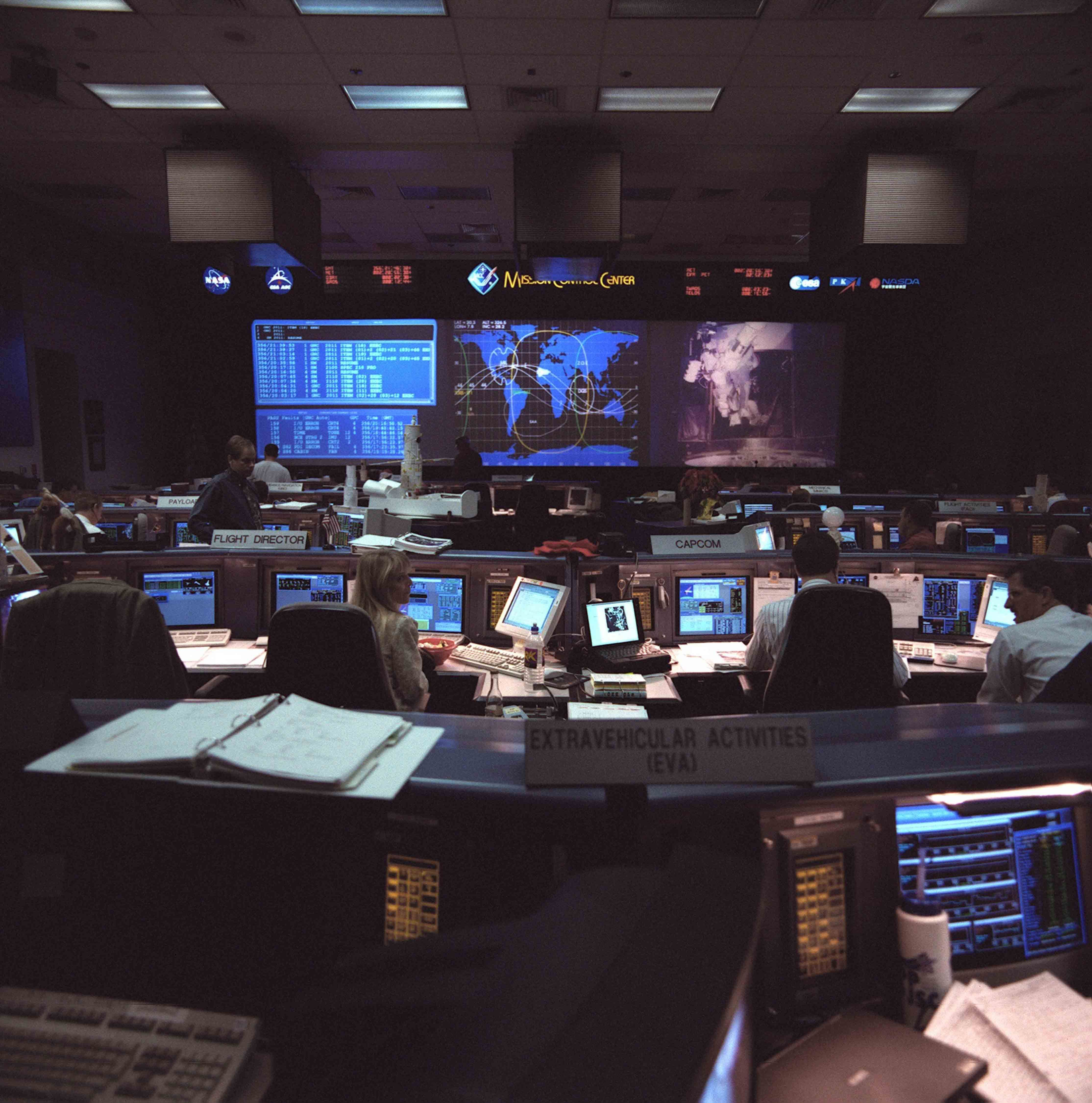 Johnson Space Center Mission Control Center in Houston, Texas is captured during the first spacewalk of the STS-103 mission to service the Hubble Space Telescope (HST). A large television screen seen in the front-right of the control room provided flight controllers with live downlink from Discovery. The flight director's console and that of the spacecraft communicator (CAPCOM) appear at the center of the frame.