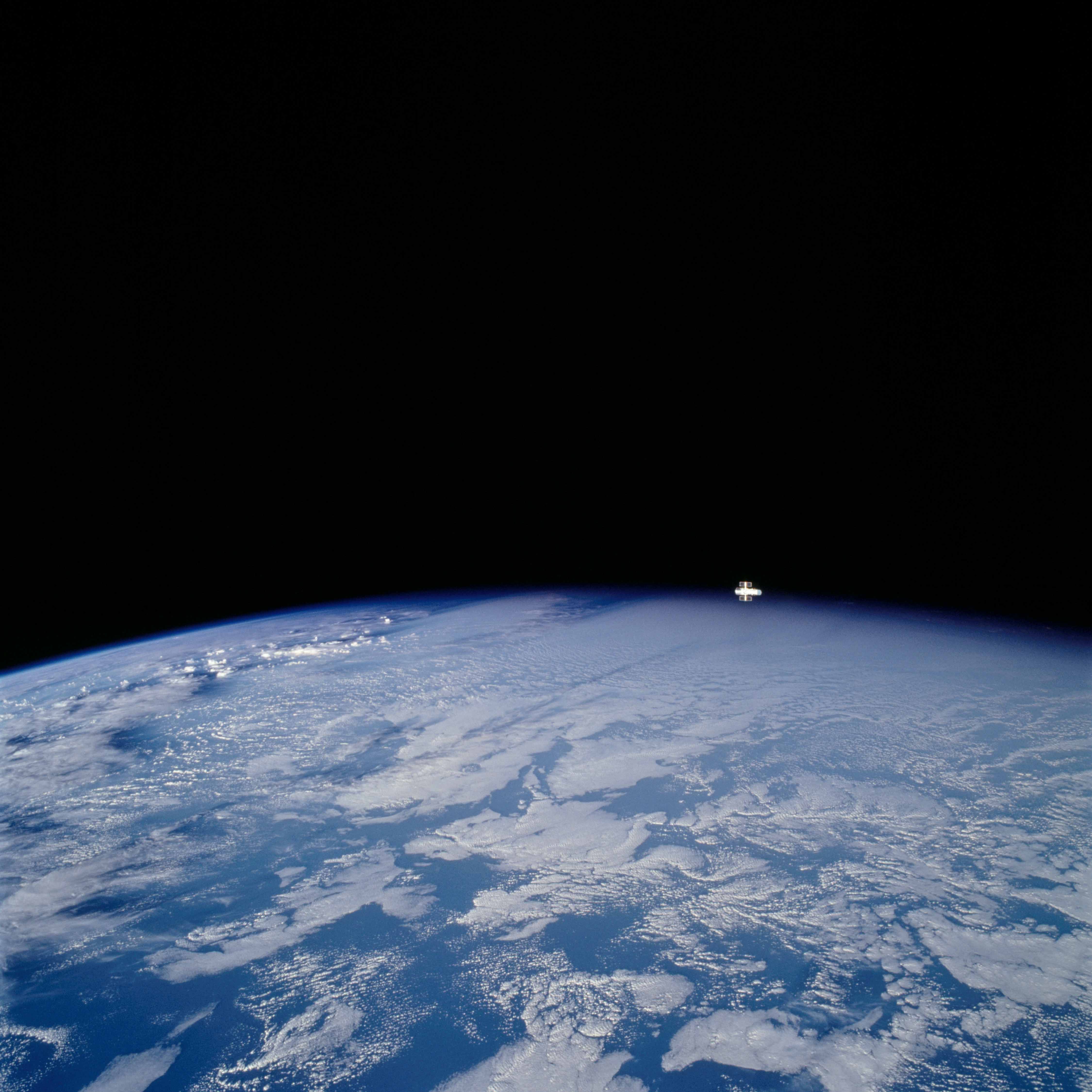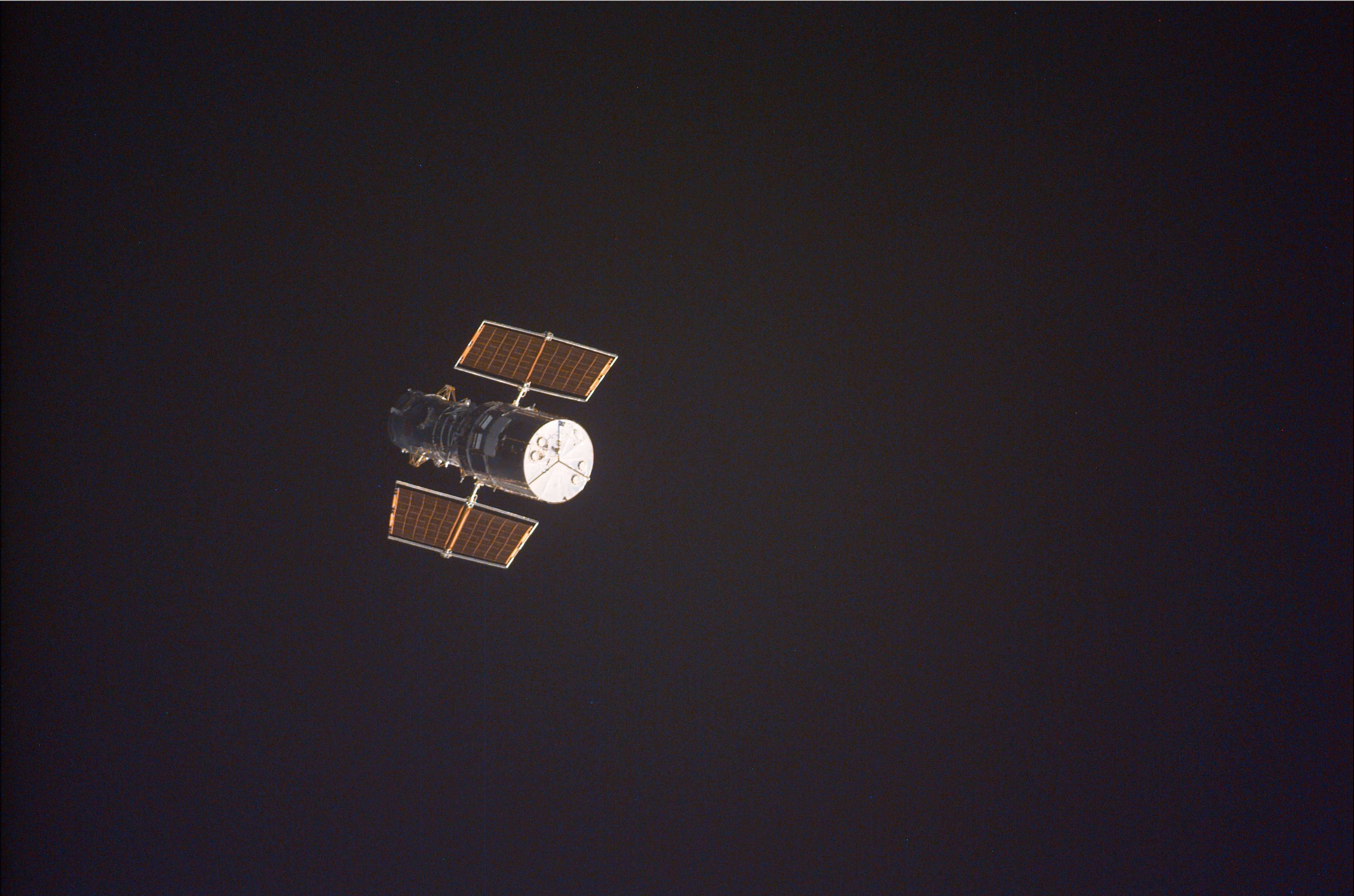 One of the STS-109 crew members photographed the newly serviced and upgraded Hubble as it neared Earth in March of 2002. The Space Shuttle Columbia was located over the Atlantic Ocean southwest of the Cape Verde Islands when this image was taken.