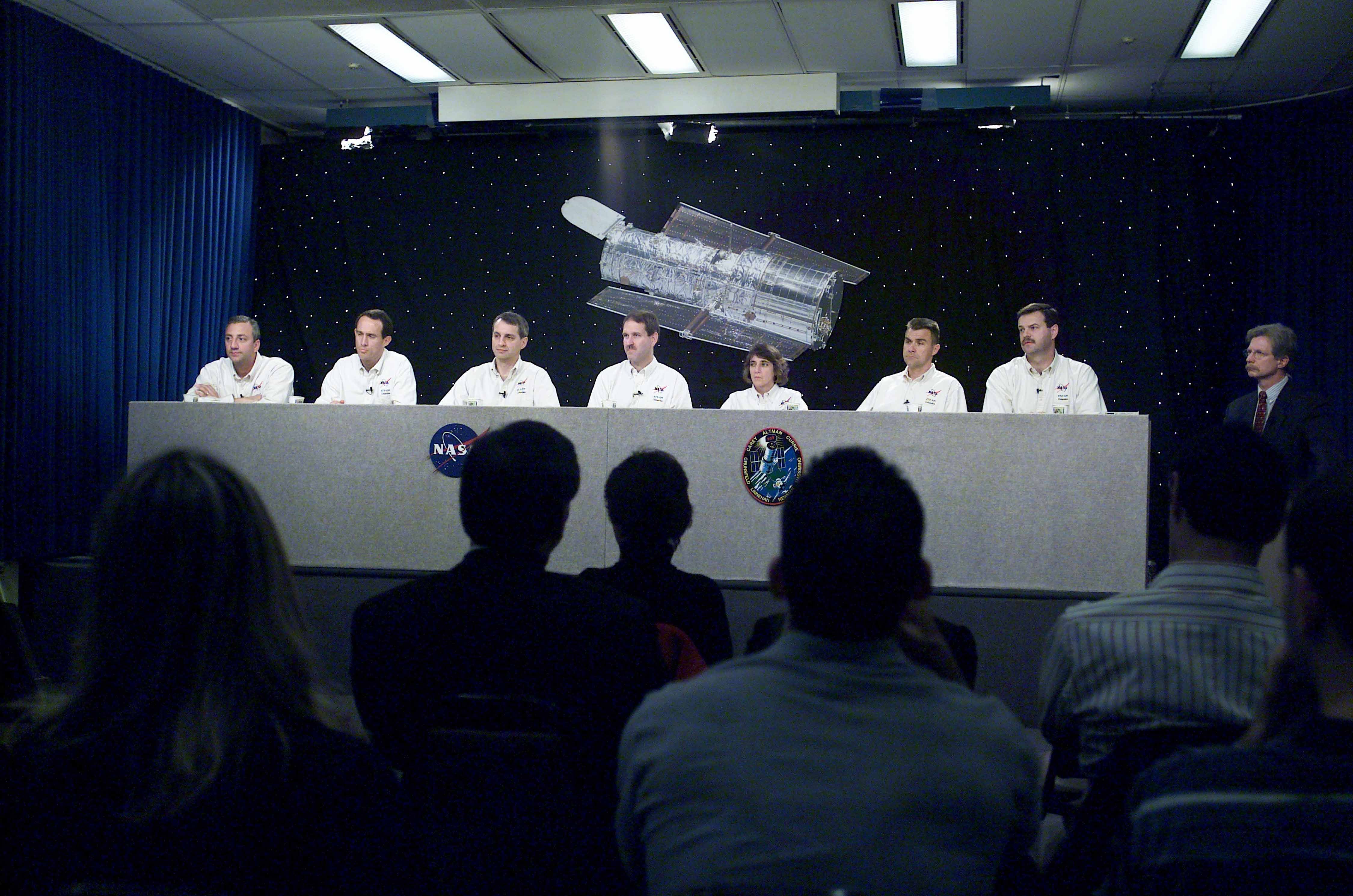 The STS-109 crew members are photographed during a preflight news conference at NASA's Johnson Space Center (JSC). From the left are astronauts Michael J. Massimino, James H. Newman, Richard M. Linnehan, John M. Grunsfeld, Nancy J. Currie, Duane G. Carey, and Scott D. Altman. Altman and Carey were mission commander and pilot, respectively. Grunsfeld was payload commander and Currie, Linnehan, Newman and Massimino were mission specialists.