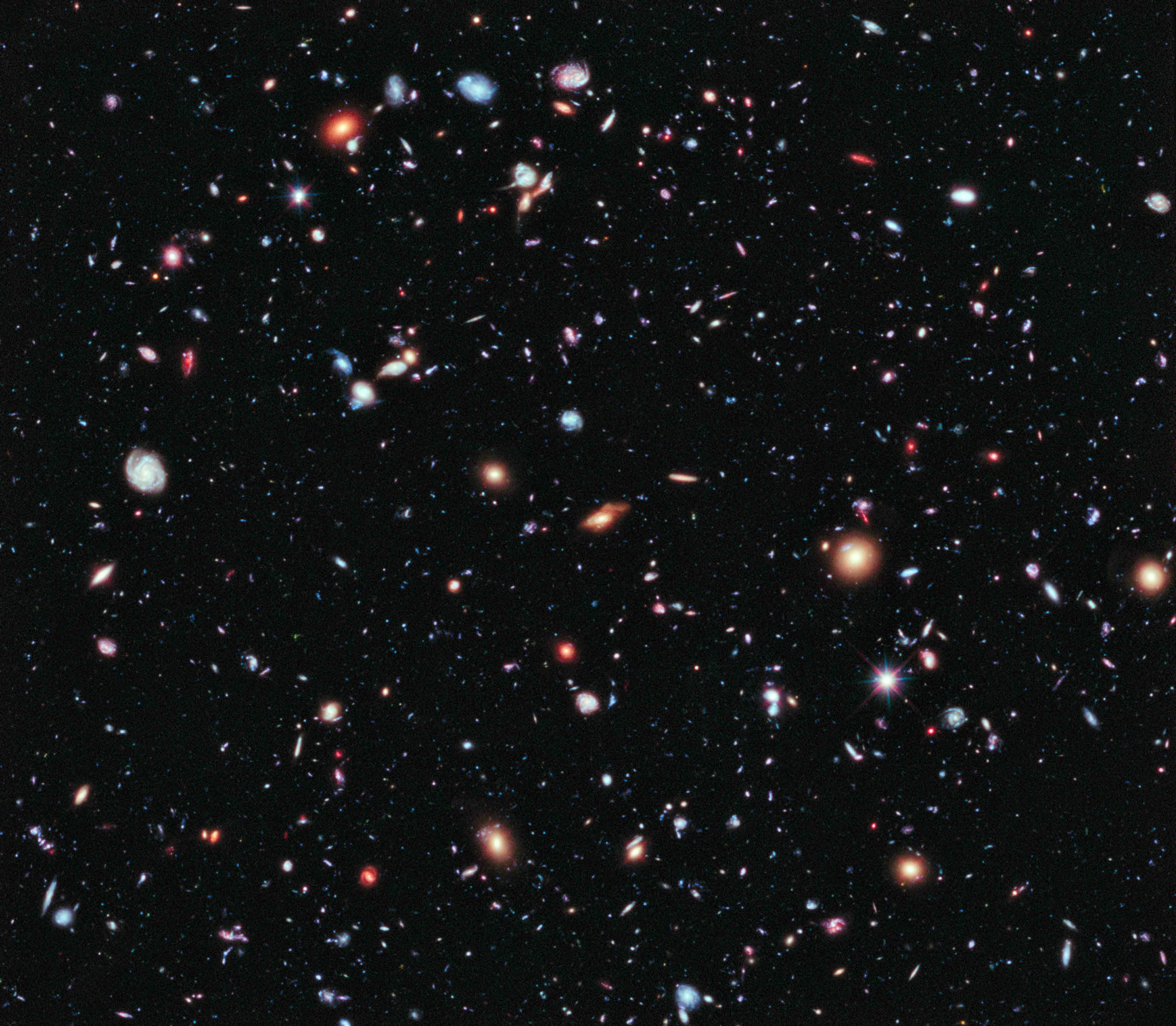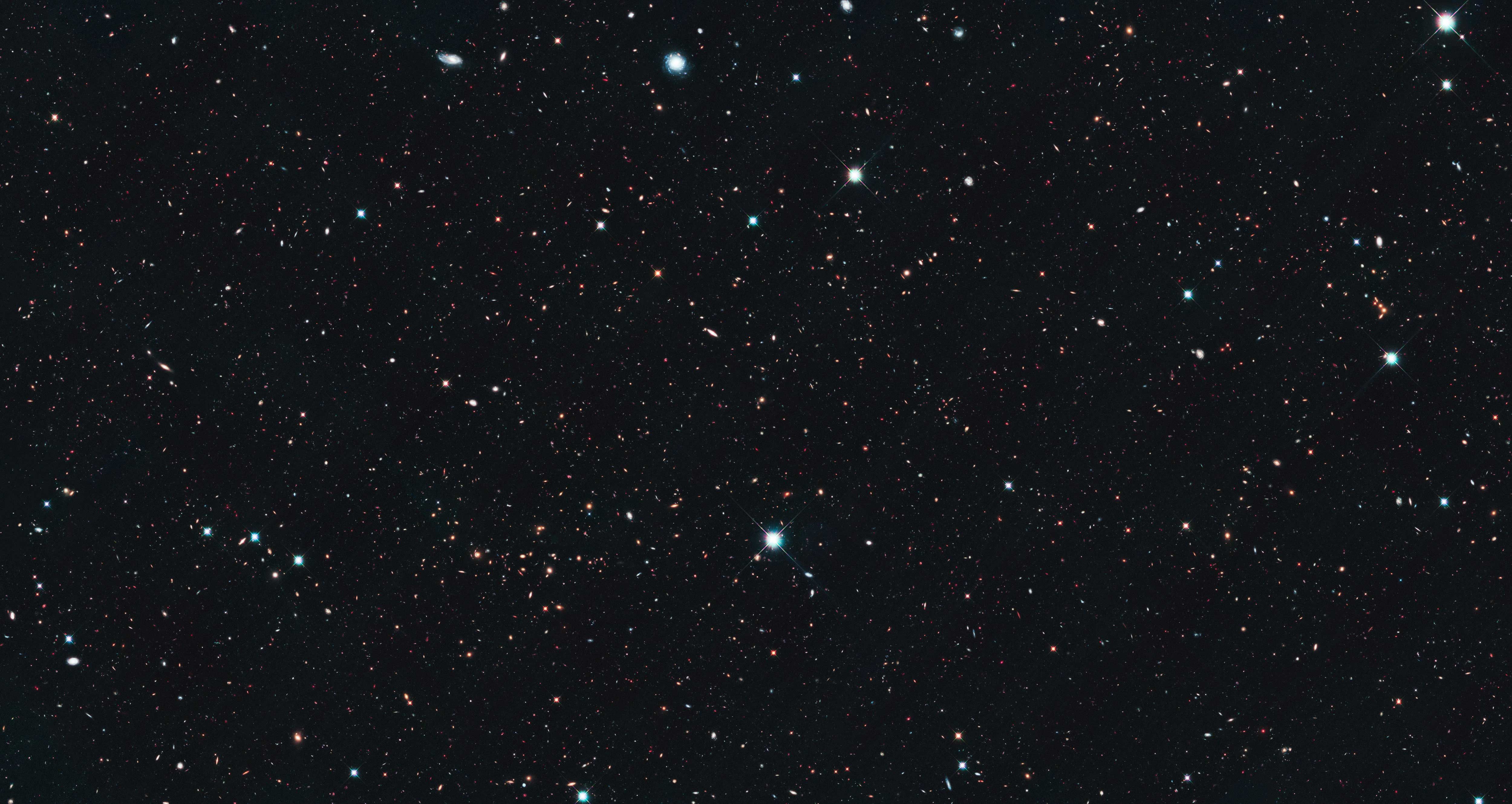 About 5,500 galaxies are visible in this image in various stages of evolution. Since light takes time to travel across the vast cosmos, many of these galaxies are seen as they were in the early history of the universe. The universe is 13.7 billion years old, and this image spans 13.2 billion years of galaxy development. The farthest galaxy found in the Hubble Extreme Deep Field existed just 450 million years after the Big Bang.