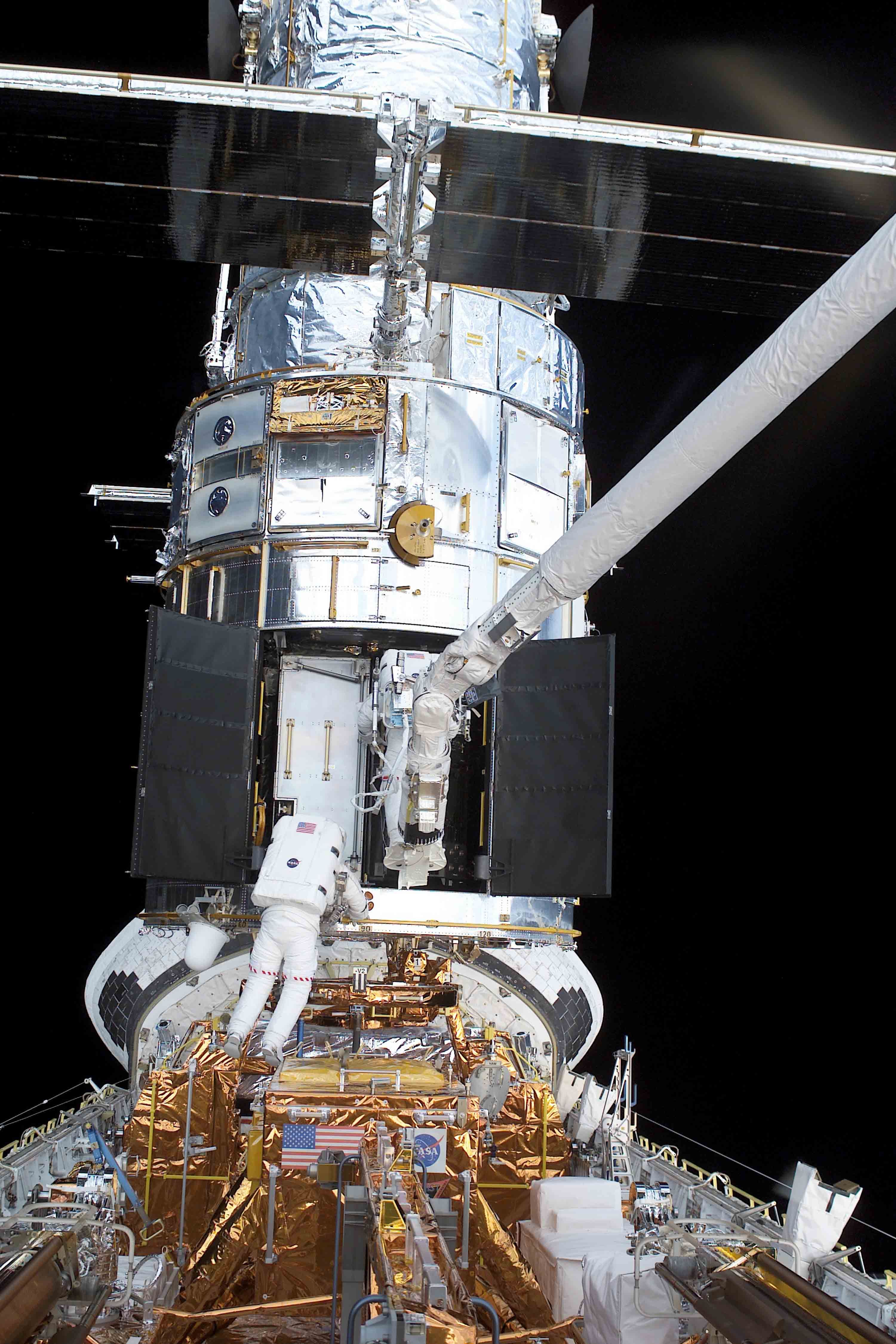 NASA astronauts James H. Newman and Mike Massimino participate in the fourth spacewalk of the STS-109 mission, the fourth servicing mission to Hubble. The two, with Newman on Columbia's Remote Manipulator System robotic arm, removed the Faint Object Camera to make room for the new Advanced Camera for Surveys.