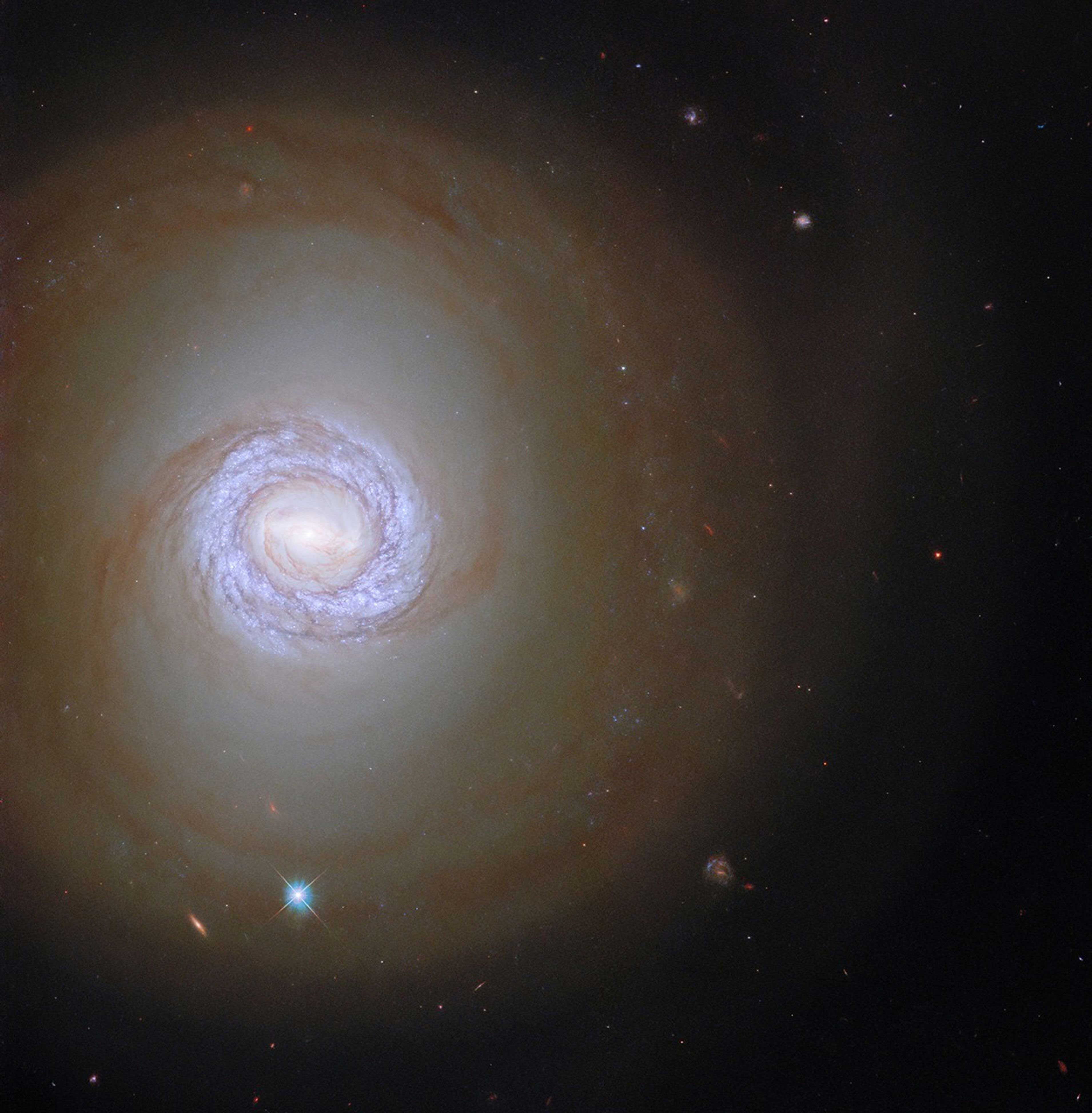 Despite the absence of its neighboring galaxy, this image finds NGC 1317 accompanied by two objects from very different parts of the universe. The bright point ringed with a crisscross pattern is a star from our own galaxy surrounded by diffraction spikes, whereas the redder elongated smudge is a distant galaxy lying far beyond NGC 1317.