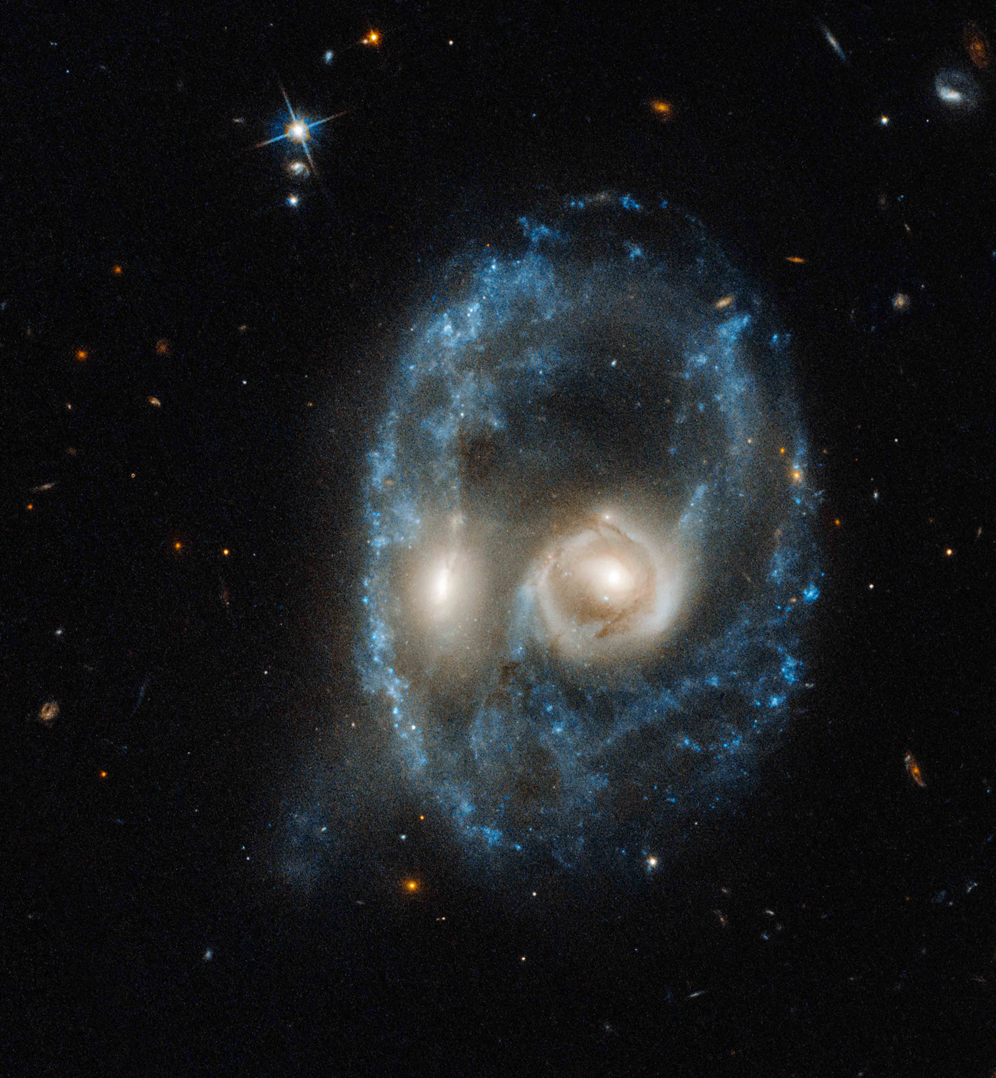 Each "eye" is the bright core of a galaxy, one of which slammed into another. The outline of the face is a ring of young blue stars. Other clumps of new stars form a nose and mouth.