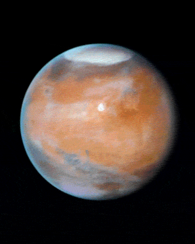 Early morning clouds can be seen along the left limb of the planet, and a large cyclonic storm composed of water ice is churning near the polar cap.