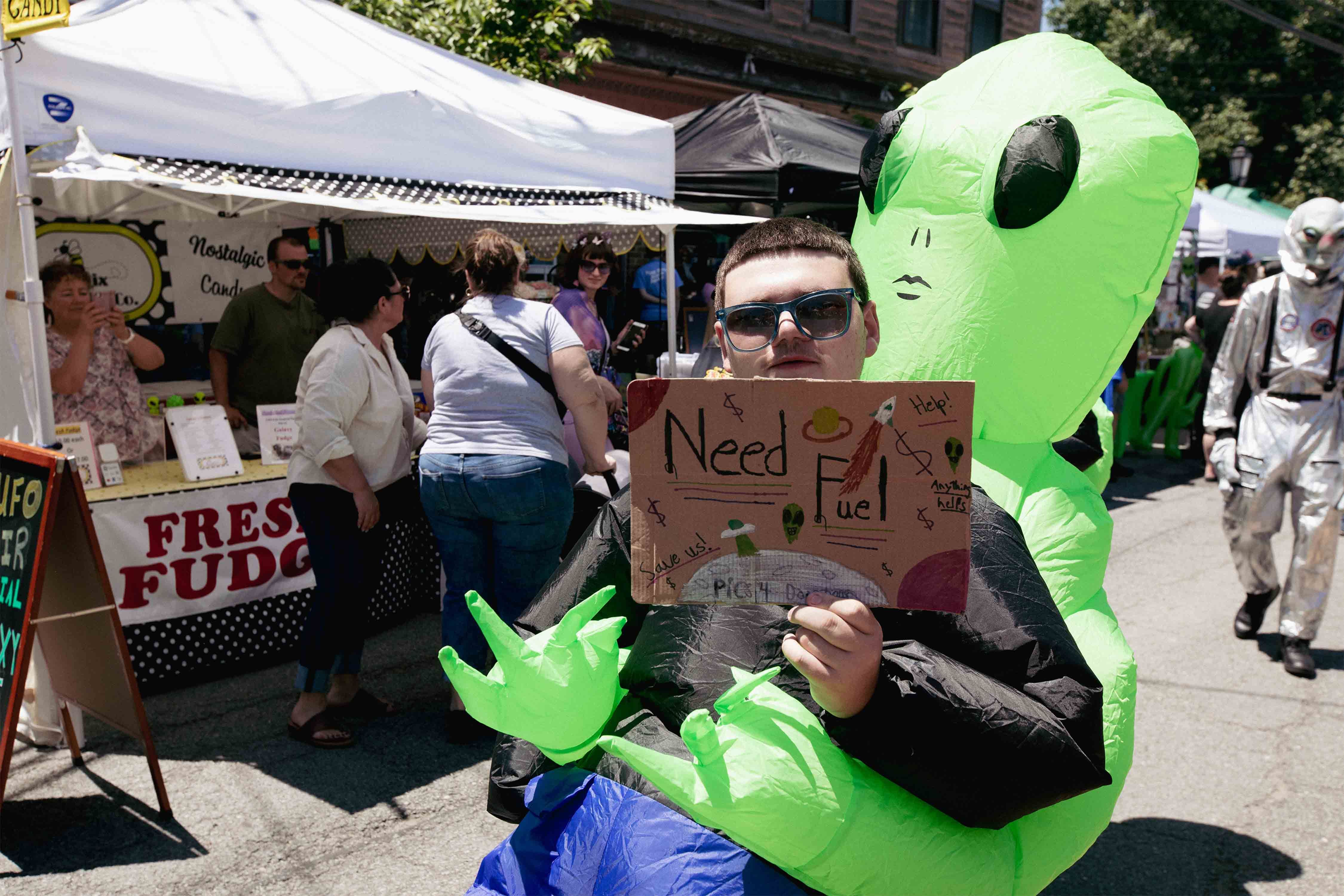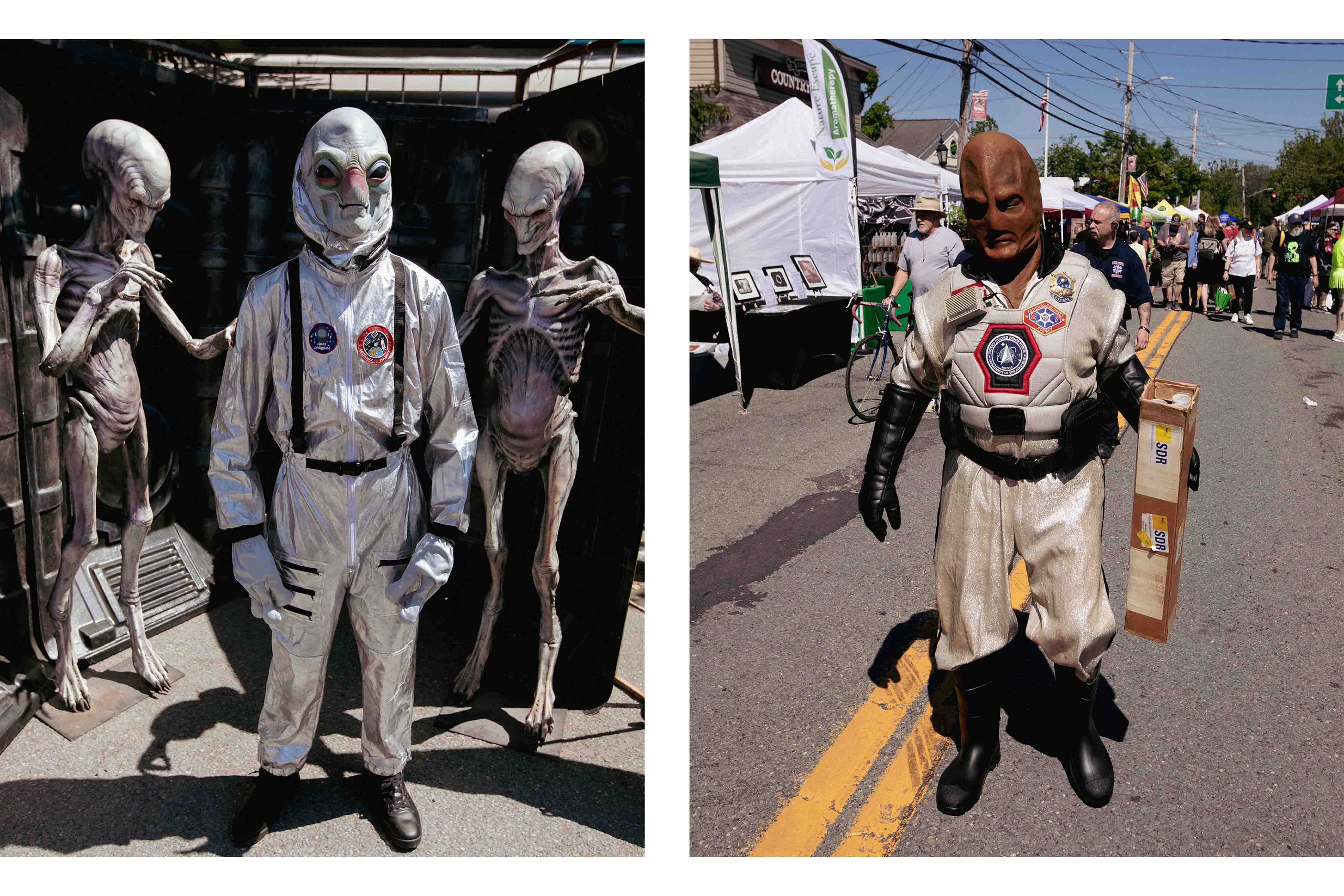 Pine Bush's yearly UFO Fair features merchandisers, food vendors, tarot card readers, self-published authors, and us, a space media company that would happily welcome a meeting with aliens or a photo of an alien spacecraft. We also make some pretty cool UFO merch, some themed for Pine Bush. Our vendor neighbors were a toy store and a soap maker. After setting up, we remarked how far we were from Cape Canaveral or Starbase, and that this isn't our usual crowd. Soon after, a man wearing a full rubber alien space warrior suite with an official U.S Space Force mission patch greeted us. "Fancy meeting you here!" as we handed him a free Supercluster launch poster. Practicing good intergalactic diplomacy, he gifted us one in return. I joked that we should carpool back to Florida.