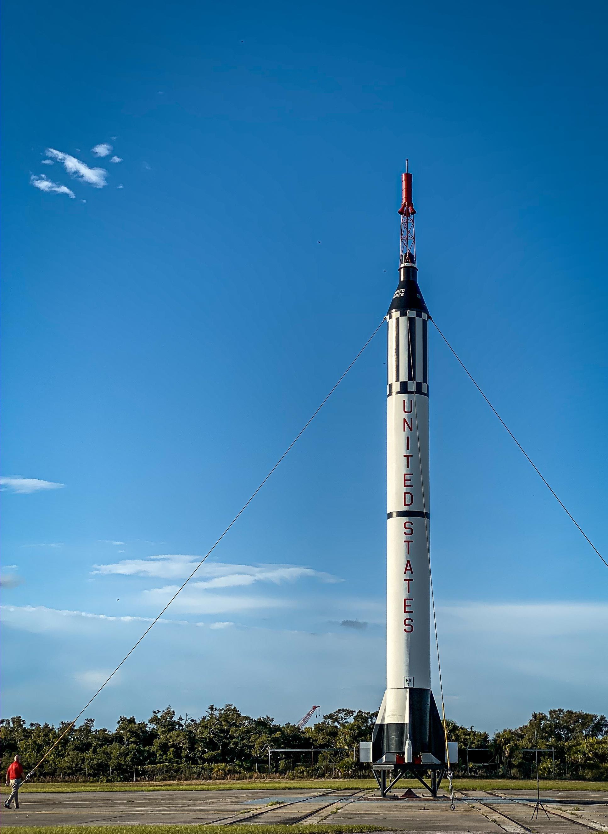 A full-sized replica of the Mercury Redstone vehicle stands on Pad 5, the site of the United States' first crewed missions.