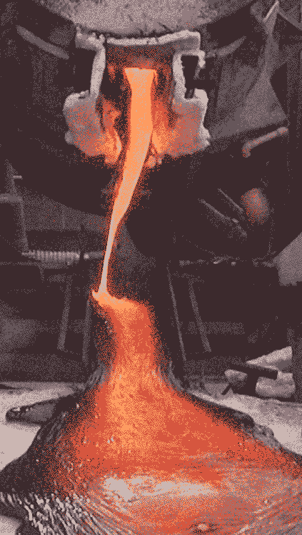 As a final pour is made, the usual last gasp of molten rock spills onto the ground, moving just under a tenth of a mile per hour. At the very last moment, and accompanied by a dramatic flourish of sparks, molten metal tips over the spout.