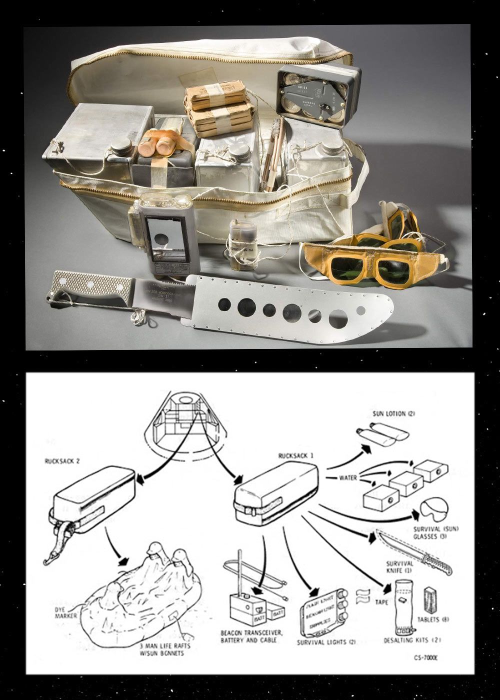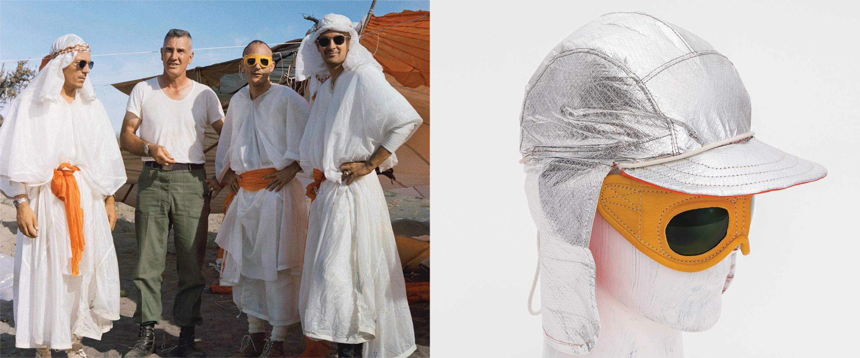 One of the first things a would-be space castaway needs is protection from the punishing, sweltering sun. The astronauts were taught to quickly transform their parachutes into robes, fashion headgear, and braid cords into rope. Their rucksacks contained some critical pieces to complete the look — NASA issue goggles, metallic sun bonnets, knives, and water pouches.