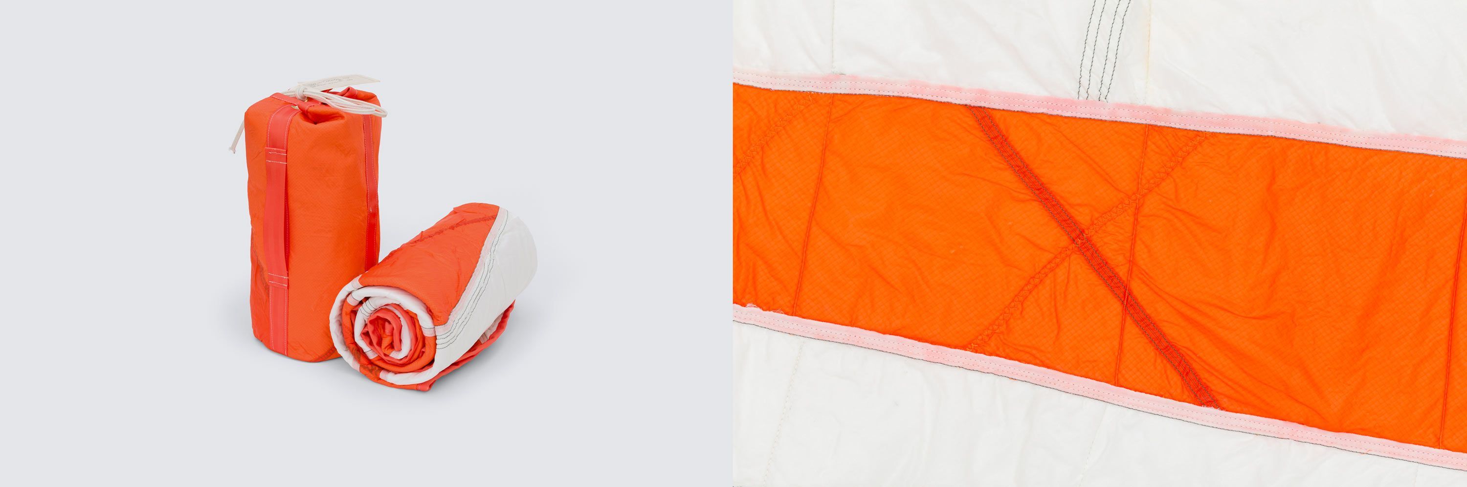The process was painstaking. “I separated each core to create a flat pattern for what became the quilt panels. I also separated the webbing reinforcement, and that was applied to the quilt. I tried to preserve all evidence of the past lives of these parachutes, and embrace the wear. It took forever, in particular, sewing had to move slowly — I had no idea how thin parachutes were.”