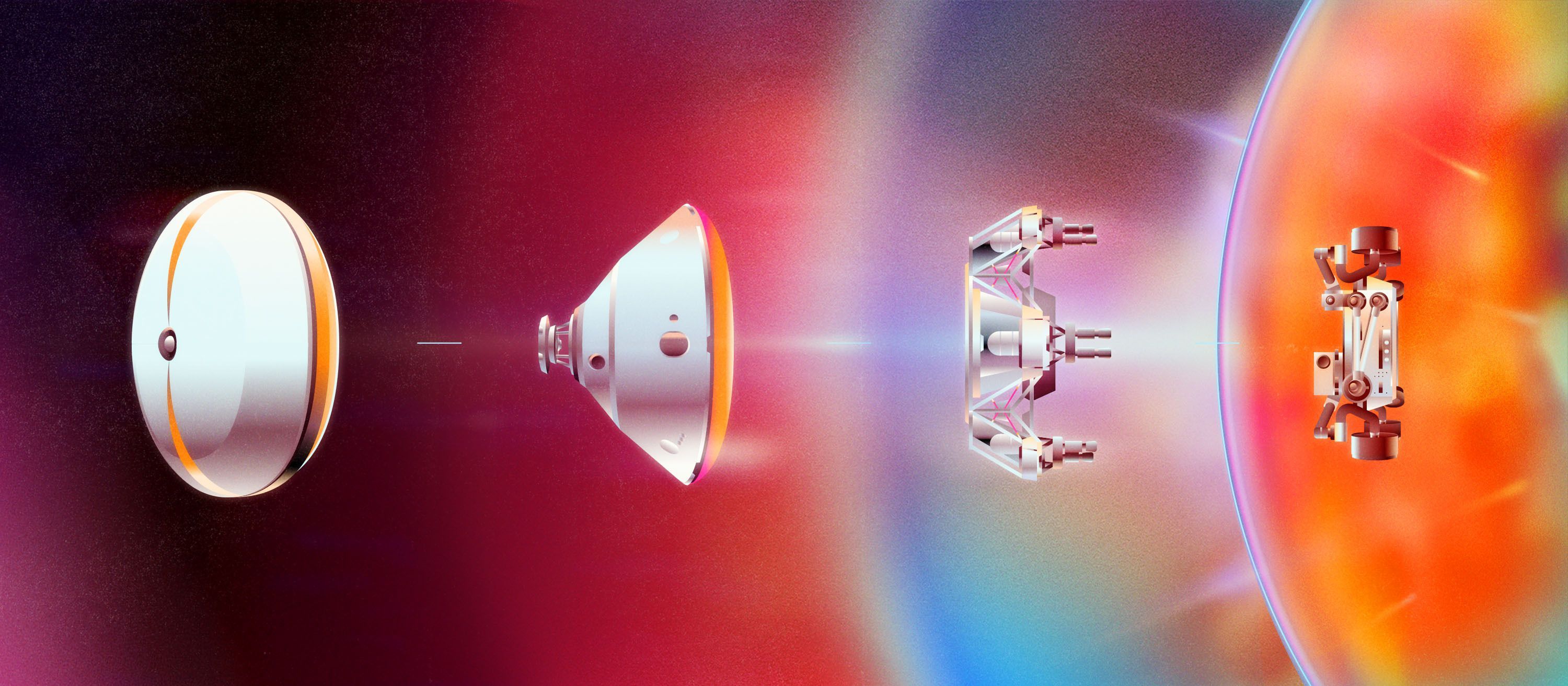 For a moment, though, really think about it. The big things. Ten minutes before Perseverance entered the Martian atmosphere, the cruise stage — the spacecraft’s thrusters, propellant, and solar power — detached from the landing system. Then the rover, encapsulated in a back shell and heatshield — the whole thing looking exactly like a flying saucer — bore down into the atmosphere of Mars for four minutes, slowing itself to a thousand miles per hour.