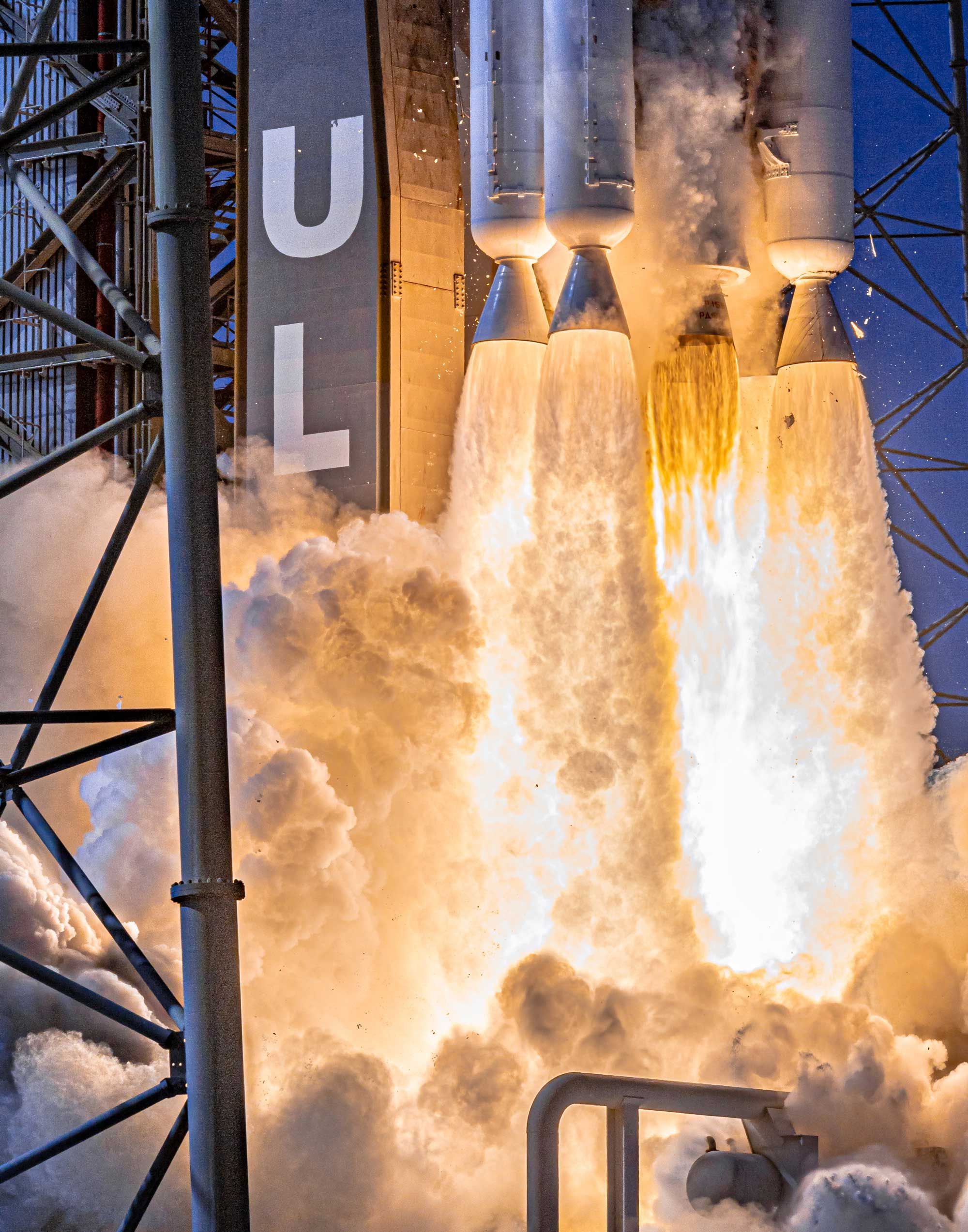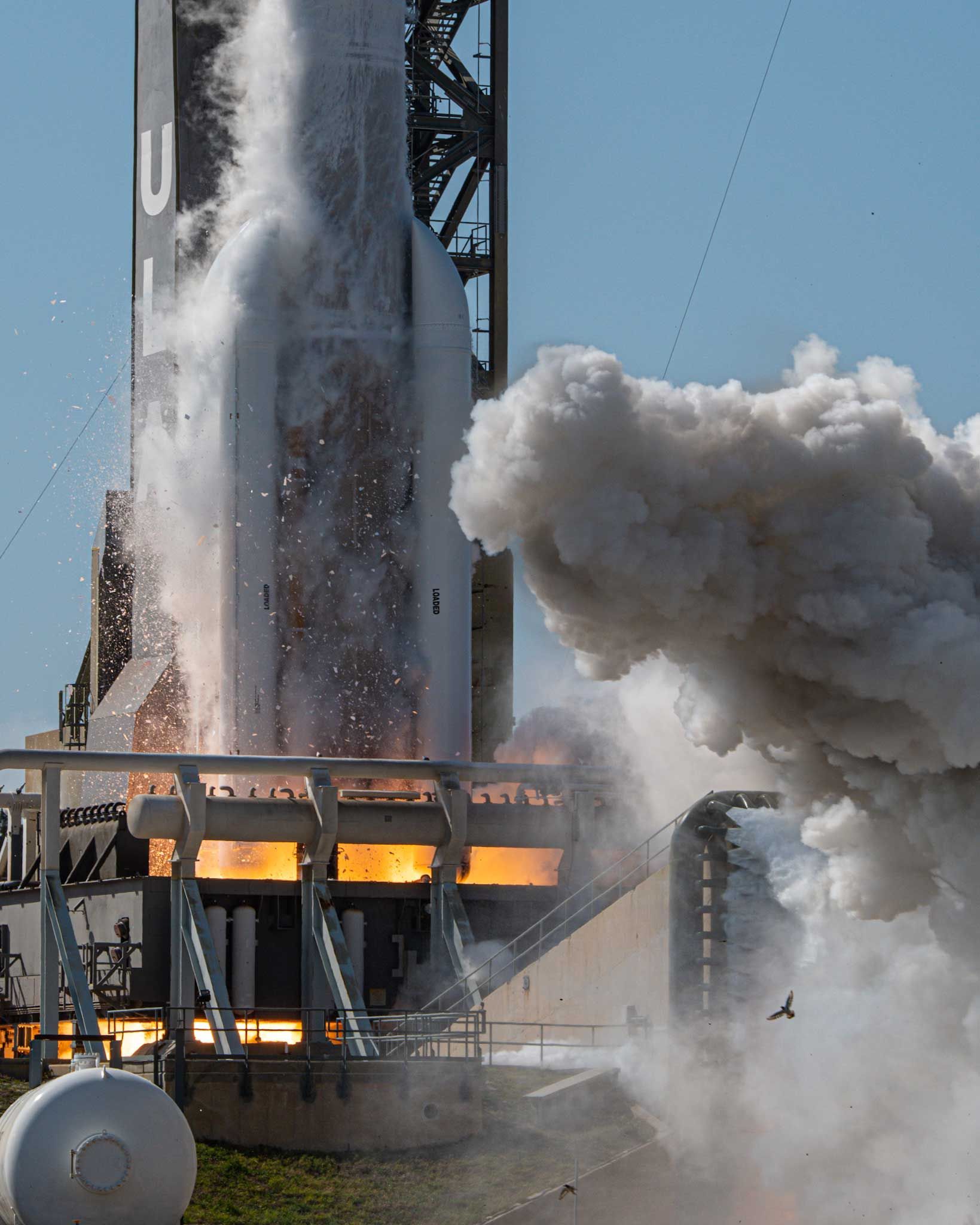 Mighty Atlas roars to life, igniting its RD-180 engine and five Aerojet Rocketdyne AJ-60A solid rocket boosters as birds flee from the launchpad.