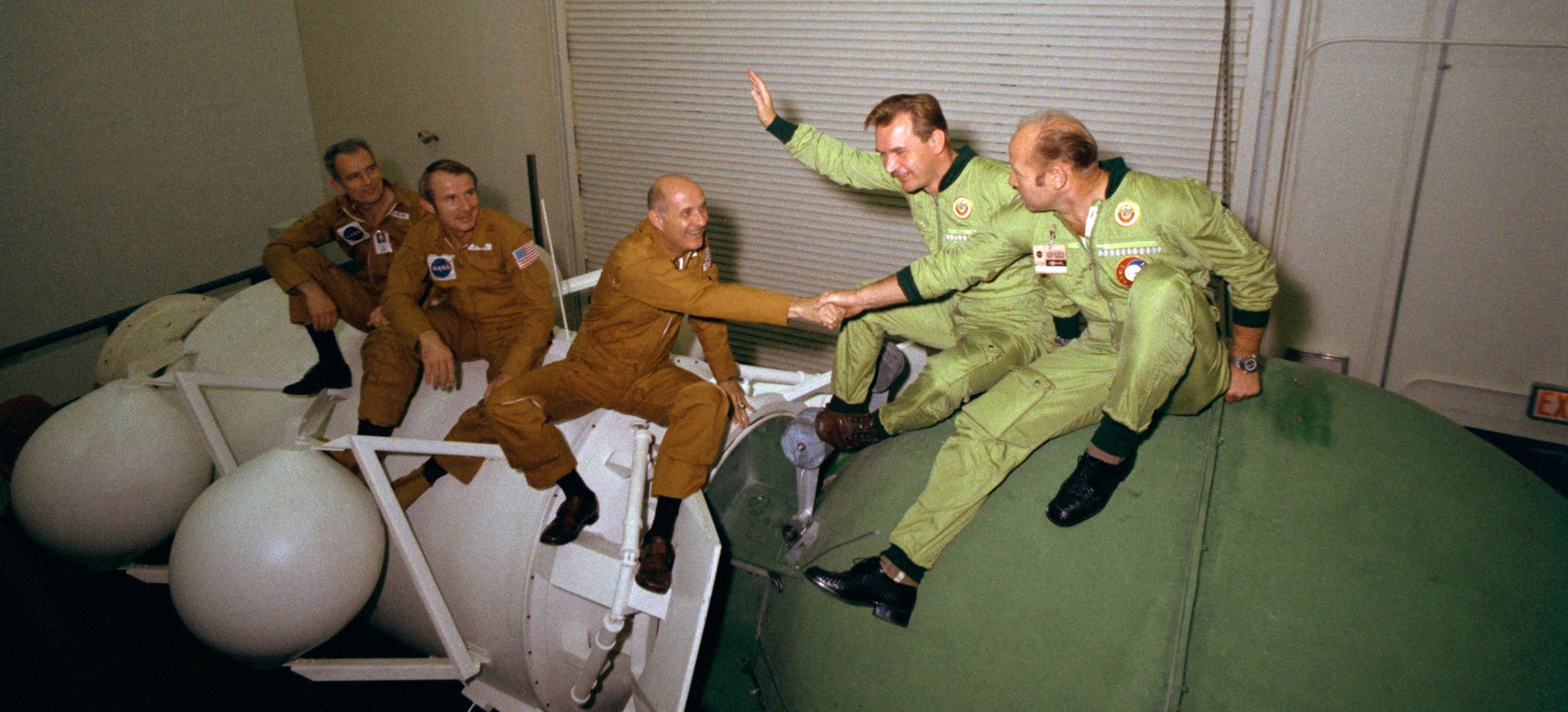 The Handshake in Space — Thomas Stafford, Apollo commander, and Alexei Leonov, Soyuz commander