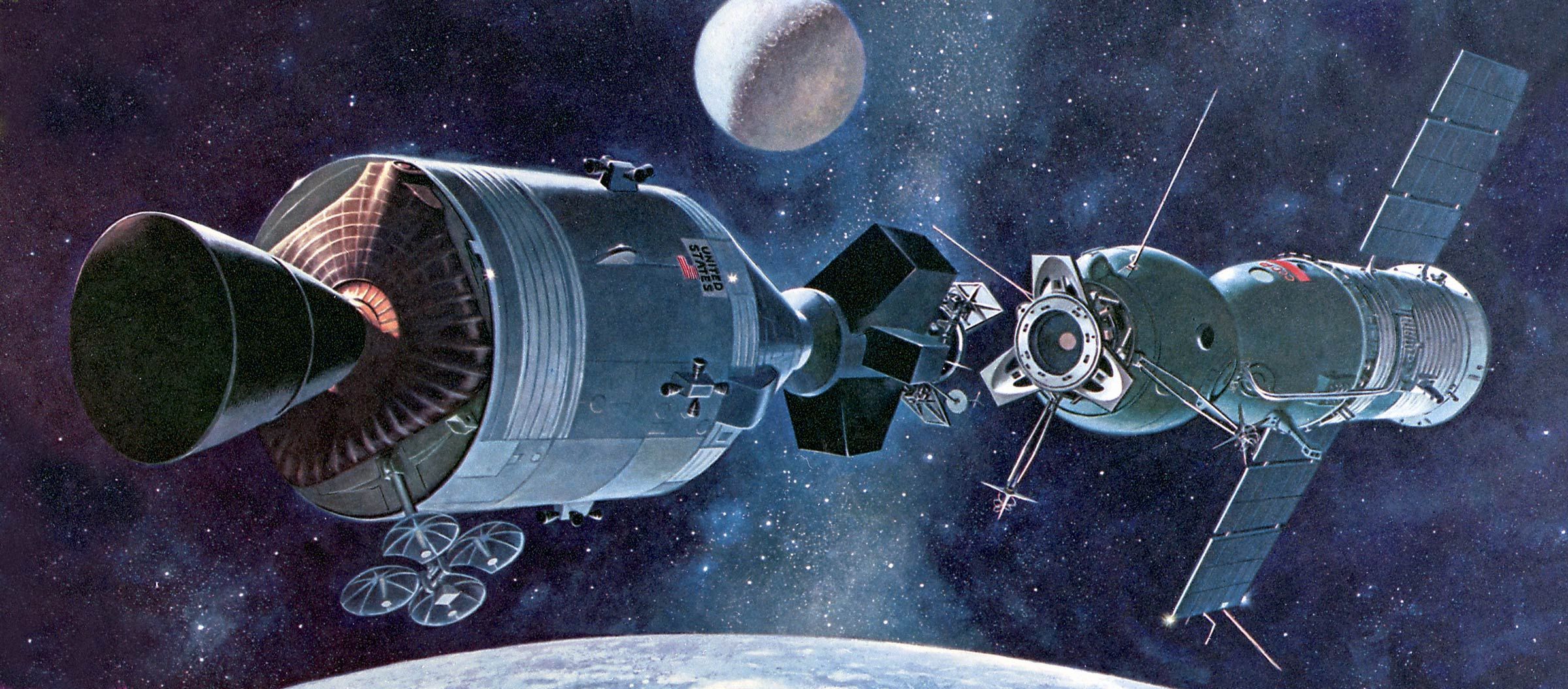 Apollo as seen from the Soyuz 19 spacecraft during rendezvous.