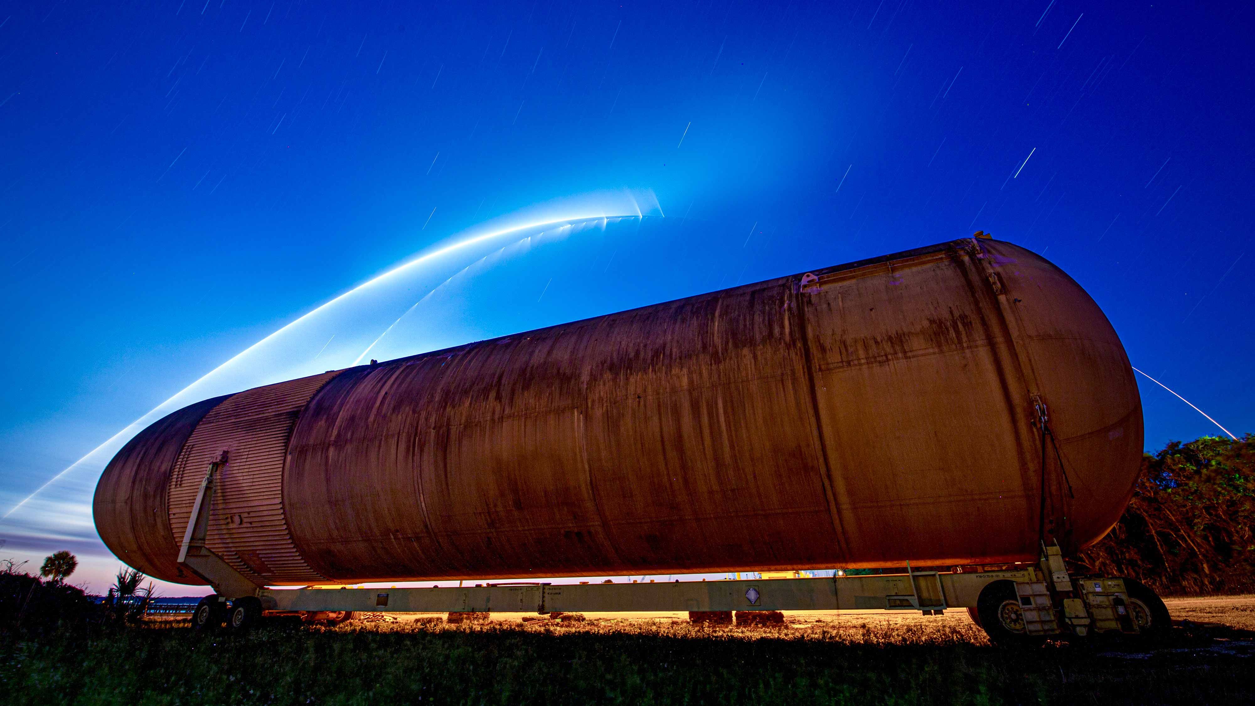 Our launch photographer Erik Kuna wanted to capture something unique for the launch so he ventured 114 miles away from Kennedy Space Center to Green Cove Springs in Florida. There, an abandoned Space Shuttle external fuel tank resides. It was the final test article produced for the shuttle program and was used for stress and structural testing at NASA's Marshall Space Flight Center in the late 70s.