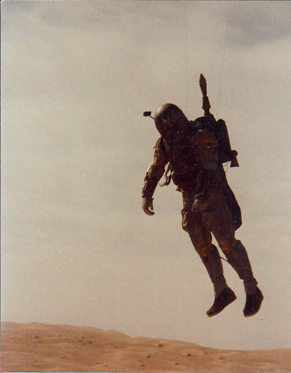 "Return of the Jedi" Stuntman Glenn Randall Jr. as Boba Fett, On Stunt Wires (1982) (photo via Boba Fett Fan Club)