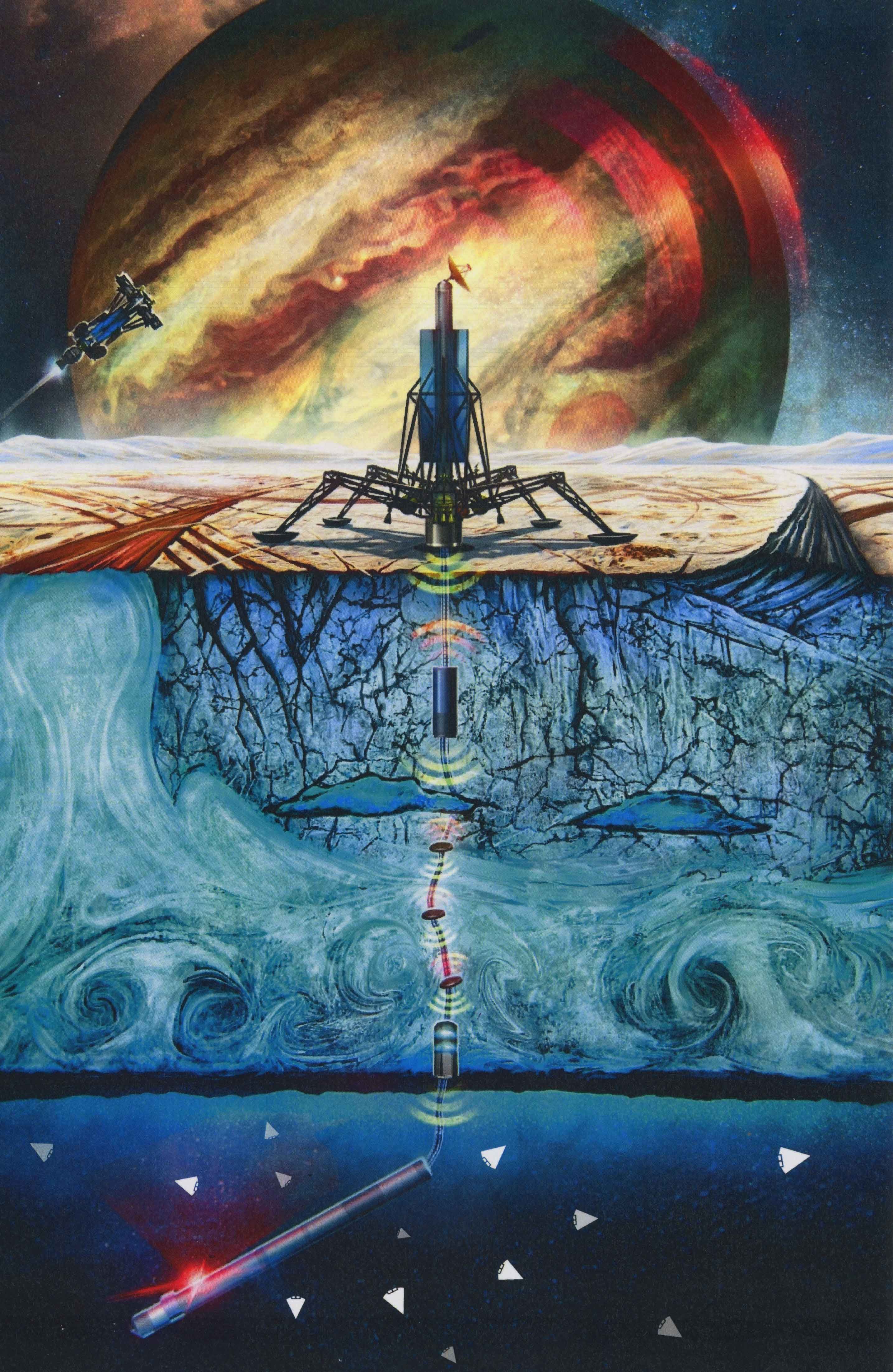This torpedo-shaped autonomous probe would arrive on Europa via a surface lander and then spend the next two to six years gliding downward. By quickly getting under a few feet of ice, electronics on the cyrobot would be shielded from the bulk of Jupiter’s radiation.