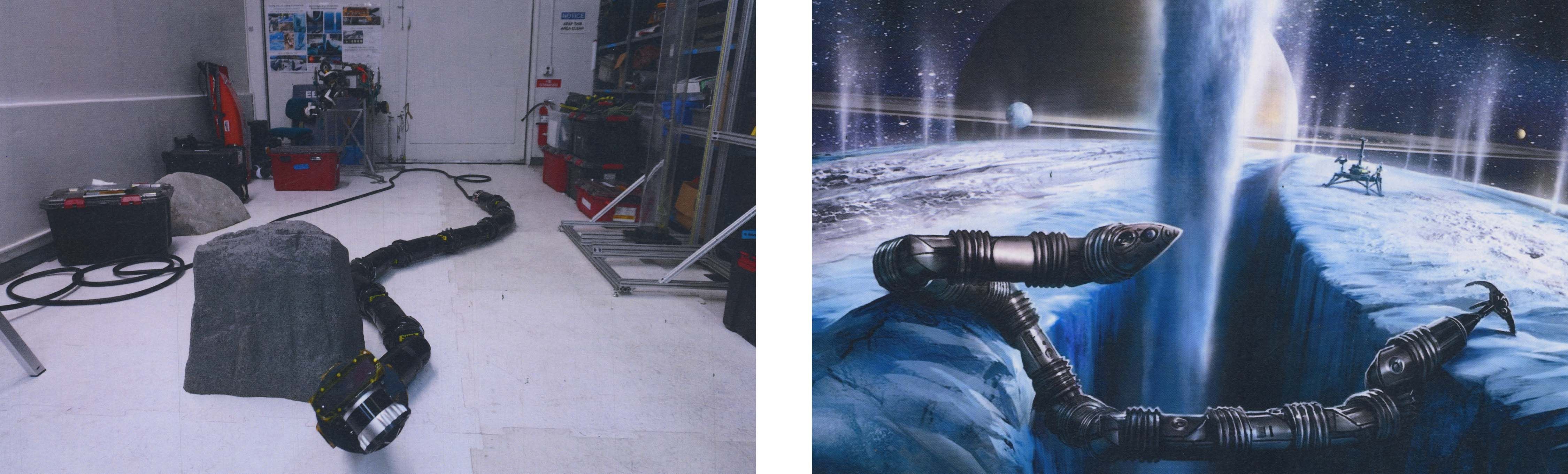Back at JPL, the Exobiology Extant Life Surveyor (EELS) project is a 13-foot-long robotic snake that is designed to mechanically slither down an icy glacial crevasse. This would come in handy on an icy moon like Saturn’s Enceladus, where plumes of water have been observed blasting up through the ice and into space.
