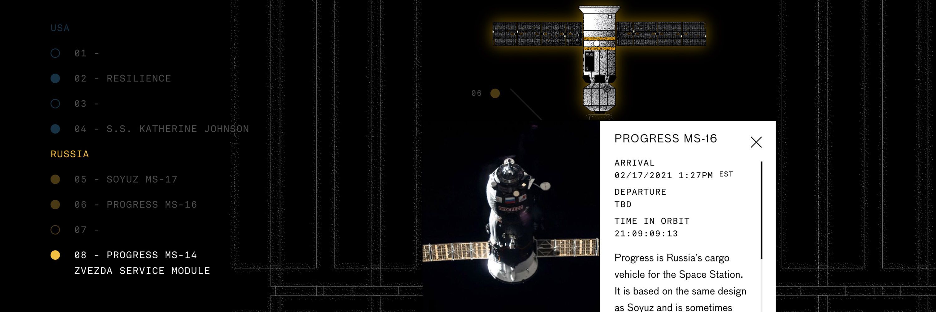 Scale was another challenge. The International Space Station is huge, and its total scope dwarfs that of each docked spacecraft. In the end the team decided to cheat the scale in favor of emphasizing content, and the orientation of each craft. “The true scale of the craft in relation to the ISS is much different from what our ISS tool shows, but that’s on purpose,” says Tristan. “We want users to immediately get a sense for what’s at The Station and where.”