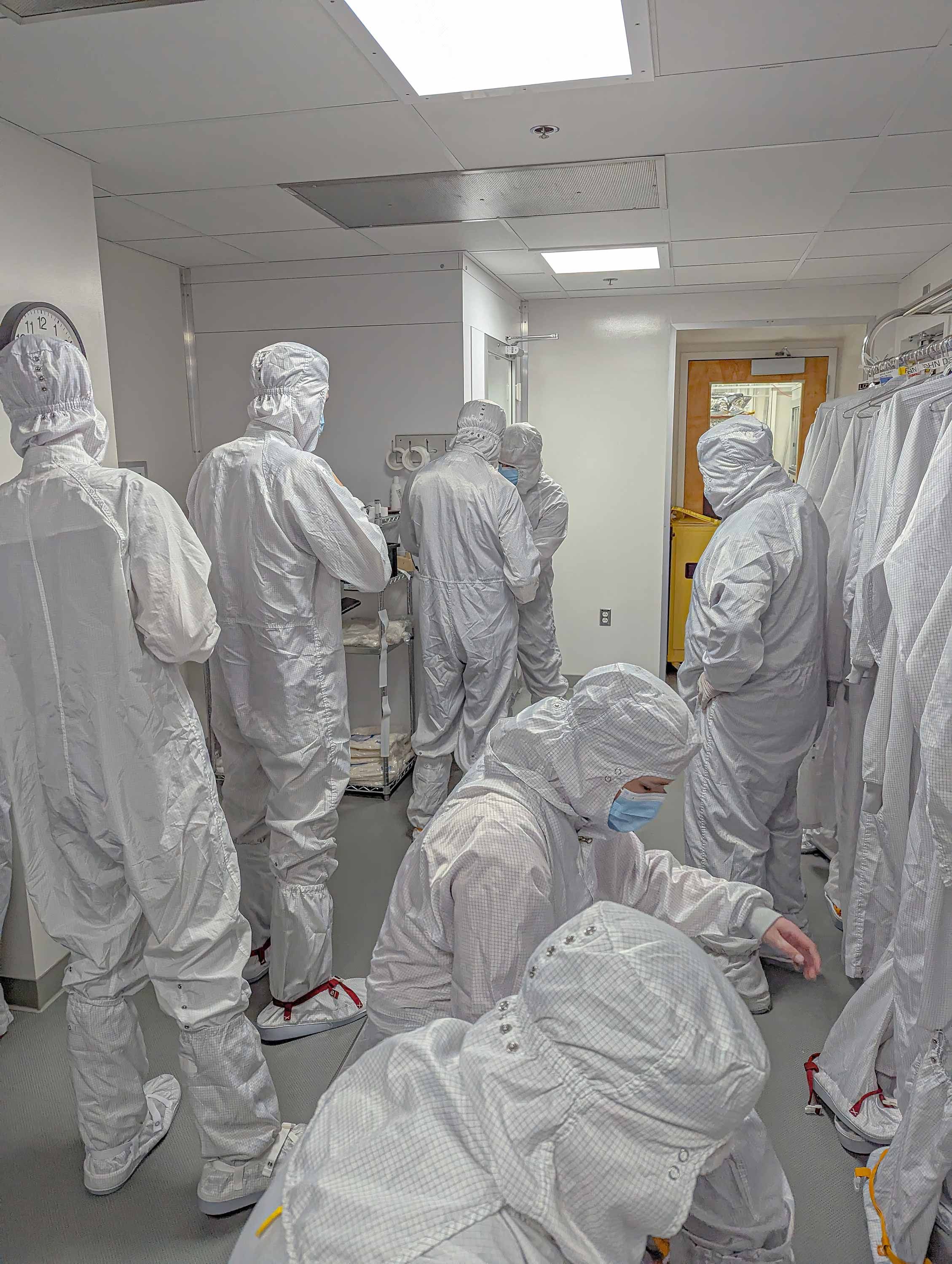 JPL provided a multi-piece suit that included shoes for your shoes, a head cover, and a one-piece coverall that zipped up to the neck. The last pieces we put on was a surgical mask and latex gloves that were taped to our “bunny” suits around the wrist. Before suiting up we stuck our sneakers in a cleaning machine and our helpers wiped down our phones and other handheld equipment.