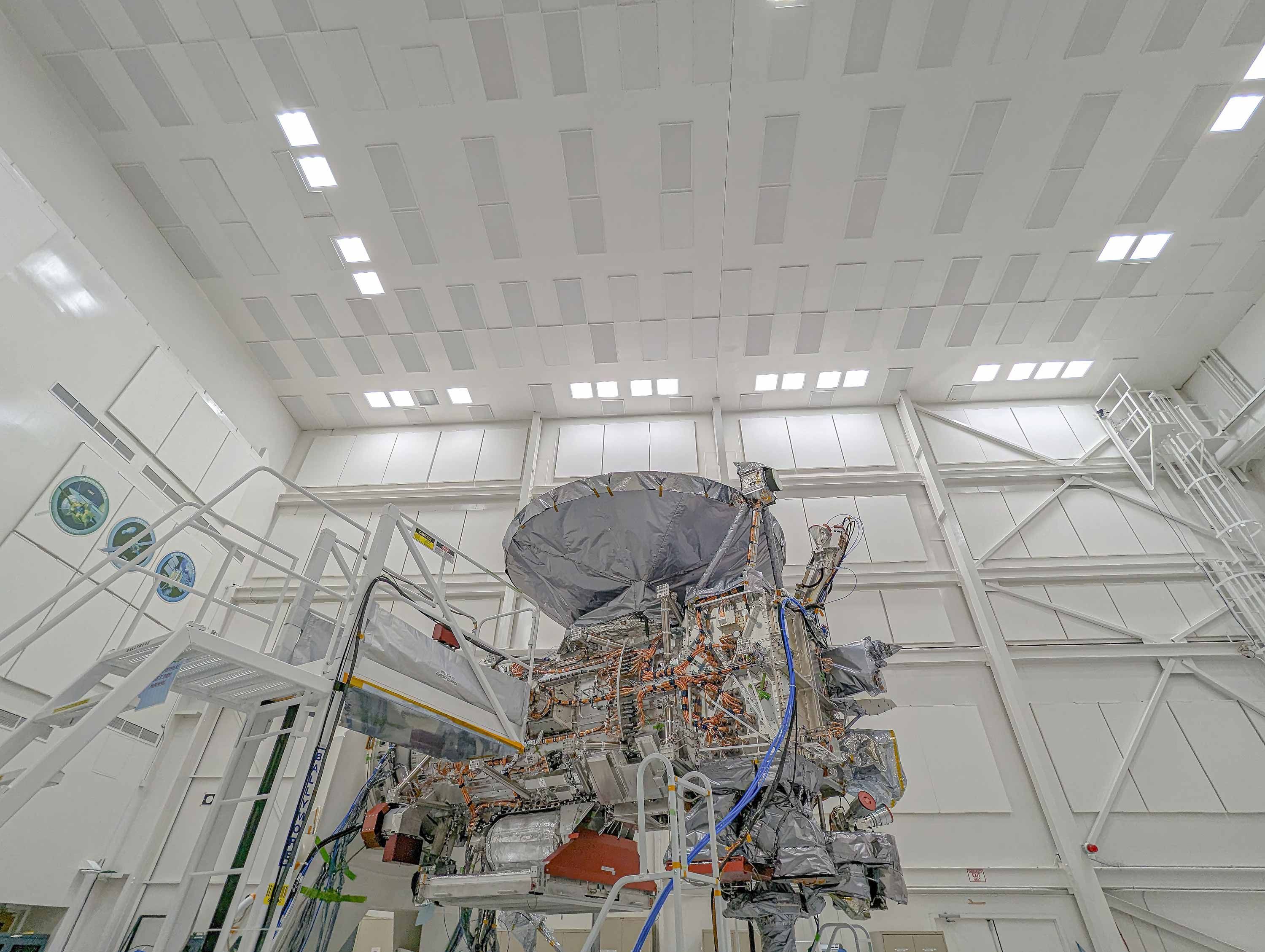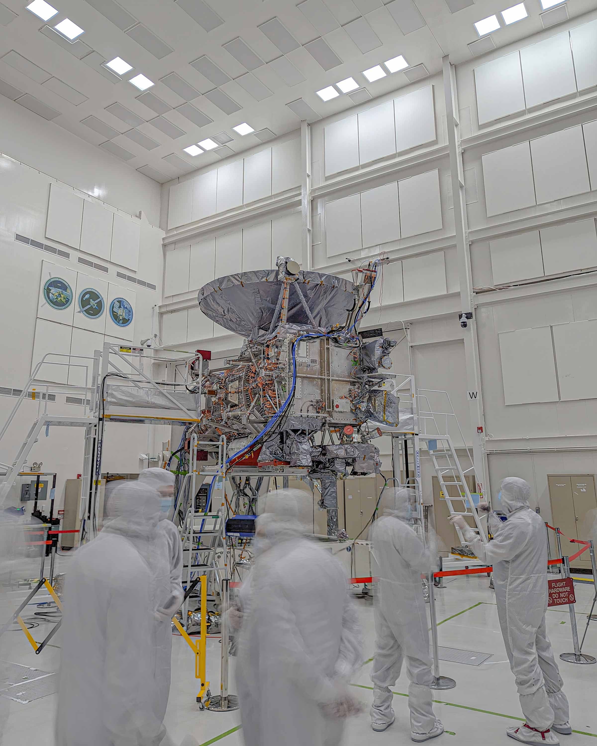 Out of all the Hollywood depictions of space exploration throughout the years, the most accurate thing that translates on screen is people putting on bunny suits. It feels as fantastical in real life as it does on the big screen and it is one of those moments in a space career that underscores the marquee reason for working in the industry: seeing spacecraft. Before we got down to the floor, our group was ushered to a guest viewing area that displays the clean room from above through glass. The scene is unreal, even for LA. A dozen white suits in a clean room that has seen some legendary missions, each commemorated with a large insignia near the ceiling of the clean room, like championship banners at sports stadiums. Viking, Curiosity, Mariner, just to name a few.